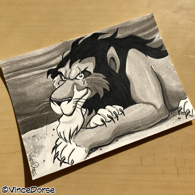 Hand-inked illustration of Simba's evil Uncle Scar on 5”x7” watercolor paper, one-of-a-kind, signed. Perfect size for pre-fab frames and mats.