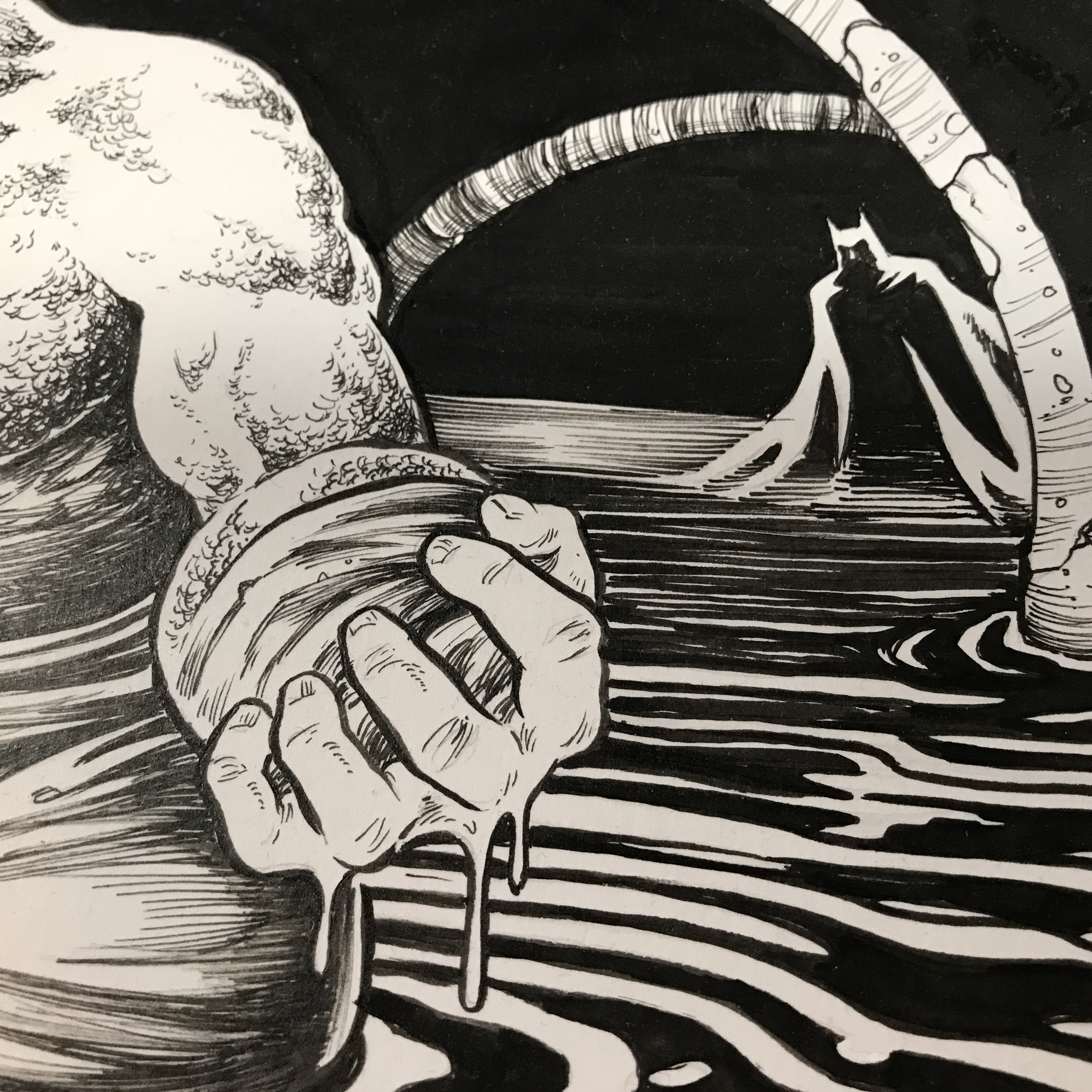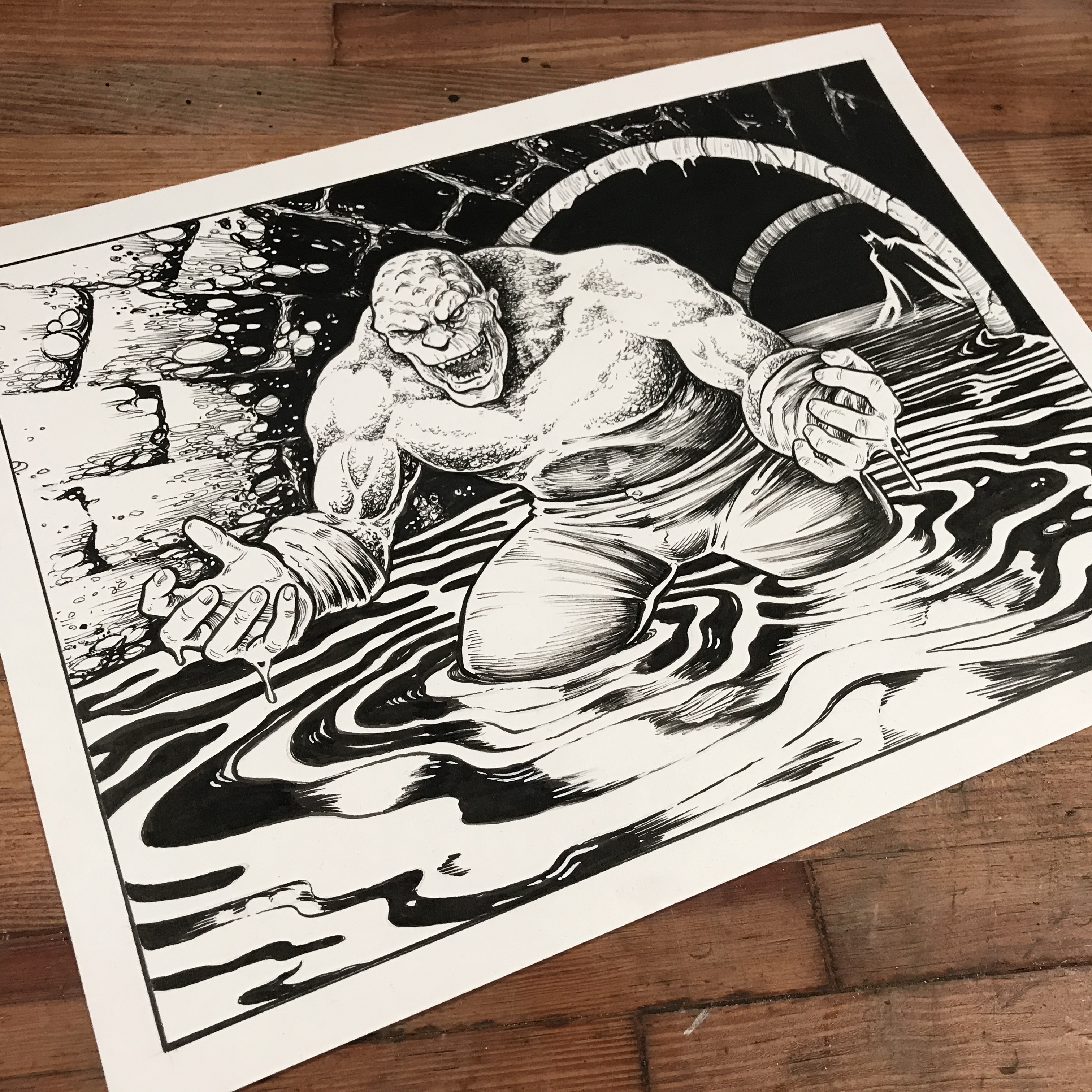 Hand-inked illustration of Killer Croc, lurking in Gotham's sewers, with the caped crusader about to close in. Done on 12”x 9” Bristol Board, one-of-a-kind, signed.