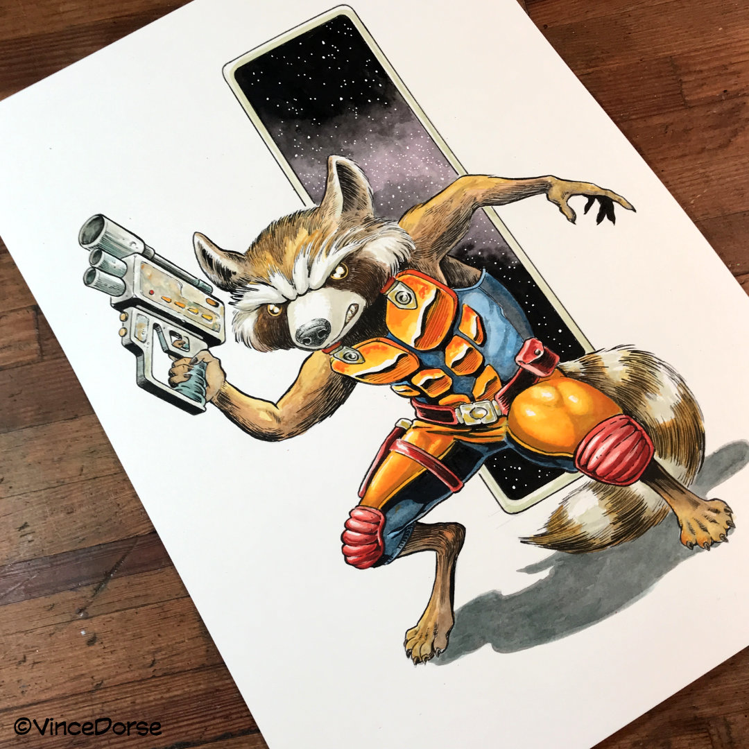 Everyone's favorite Guardian of the Galaxy, Rocket Raccoon, rendered in ink and watercolor on 10"x14" watercolor paper, one-of-a-kind, signed.